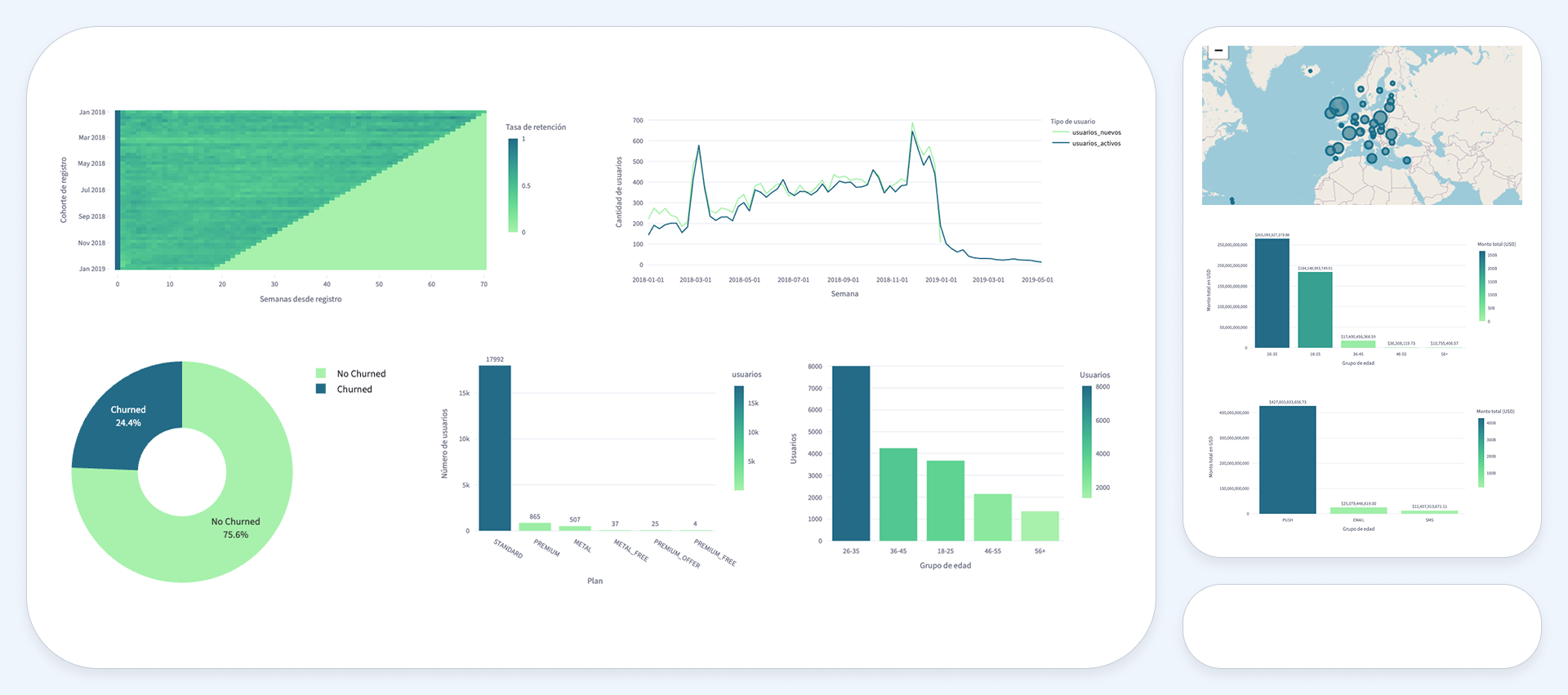 Análisis de más de 19,000 usuarios para identificar perfiles de riesgo de churn y desarrollar un modelo predictivo que permitiera anticipar el abandono y diseñar estrategias de retención específicas